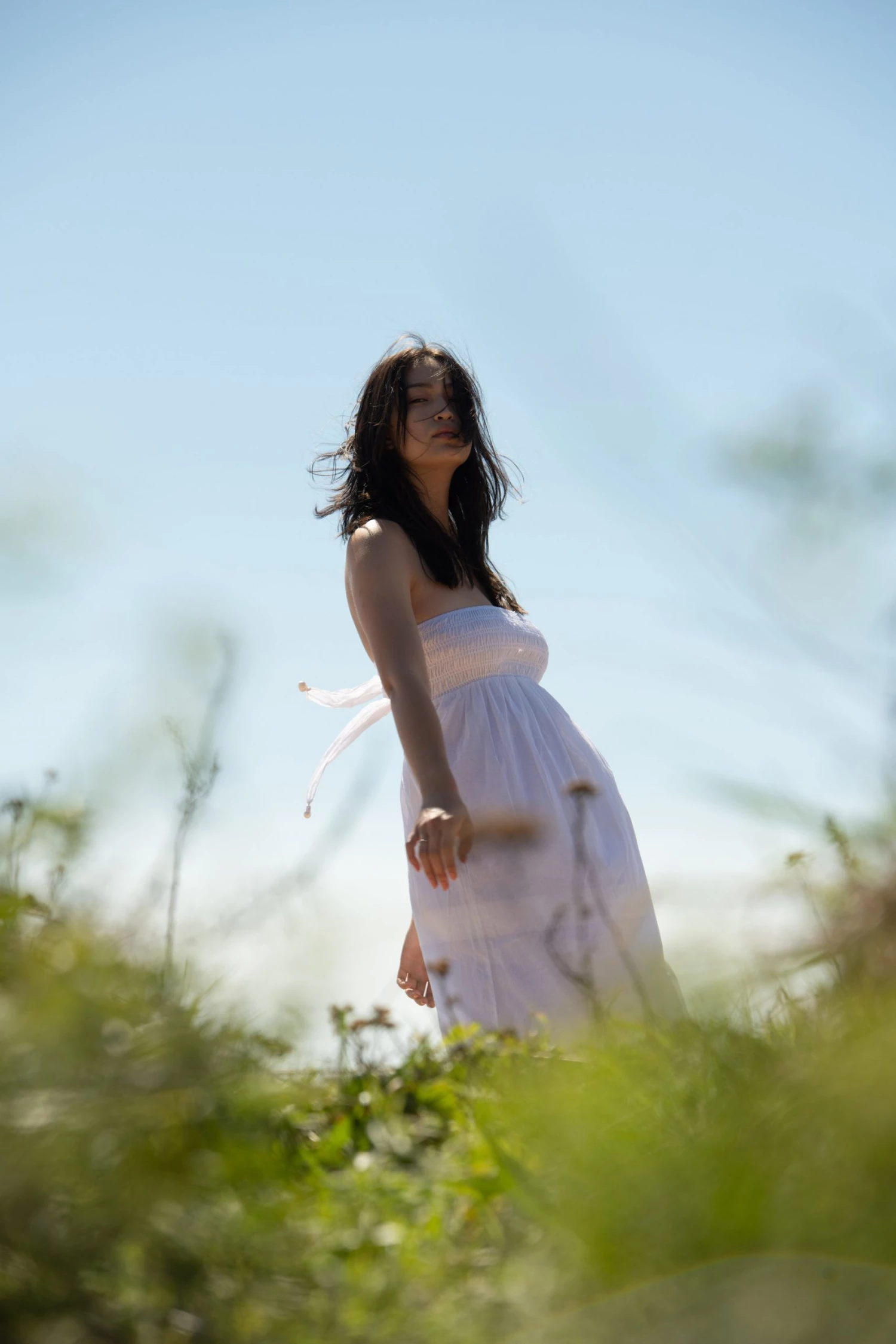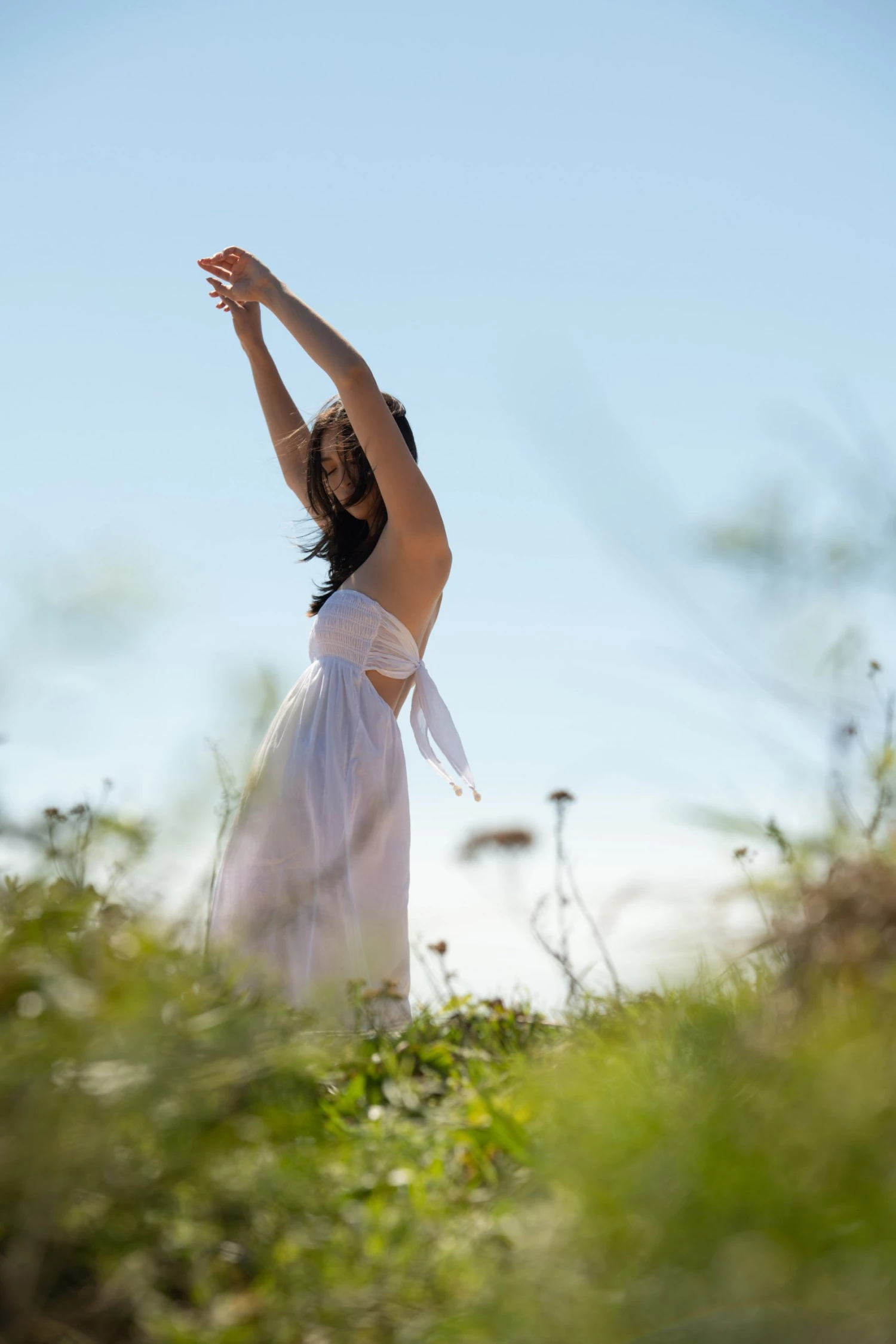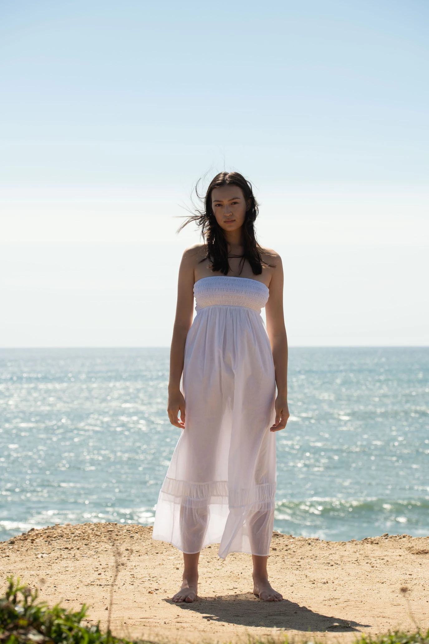 Cotton voile, smocked top, open back, pearl trim on ties