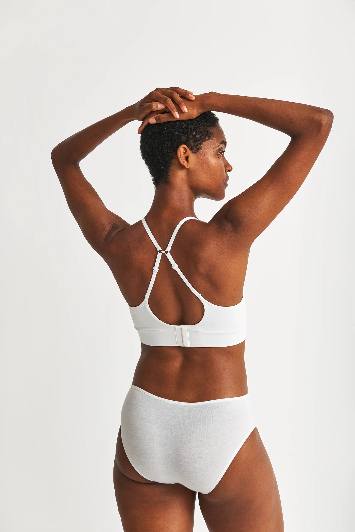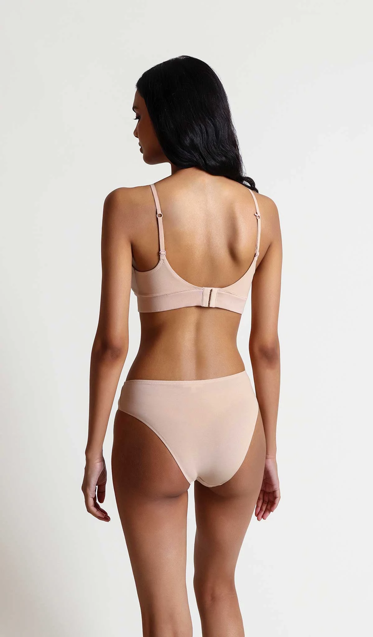 The Gita Bralette is made without bulky padding or underwire. It’s cut from a soft organic Pima Cotton-blend and has shaping darts at the front with adjustable straps.