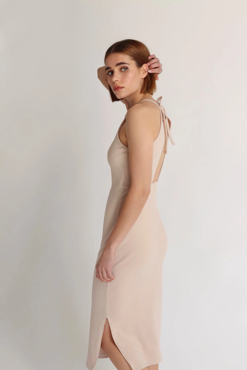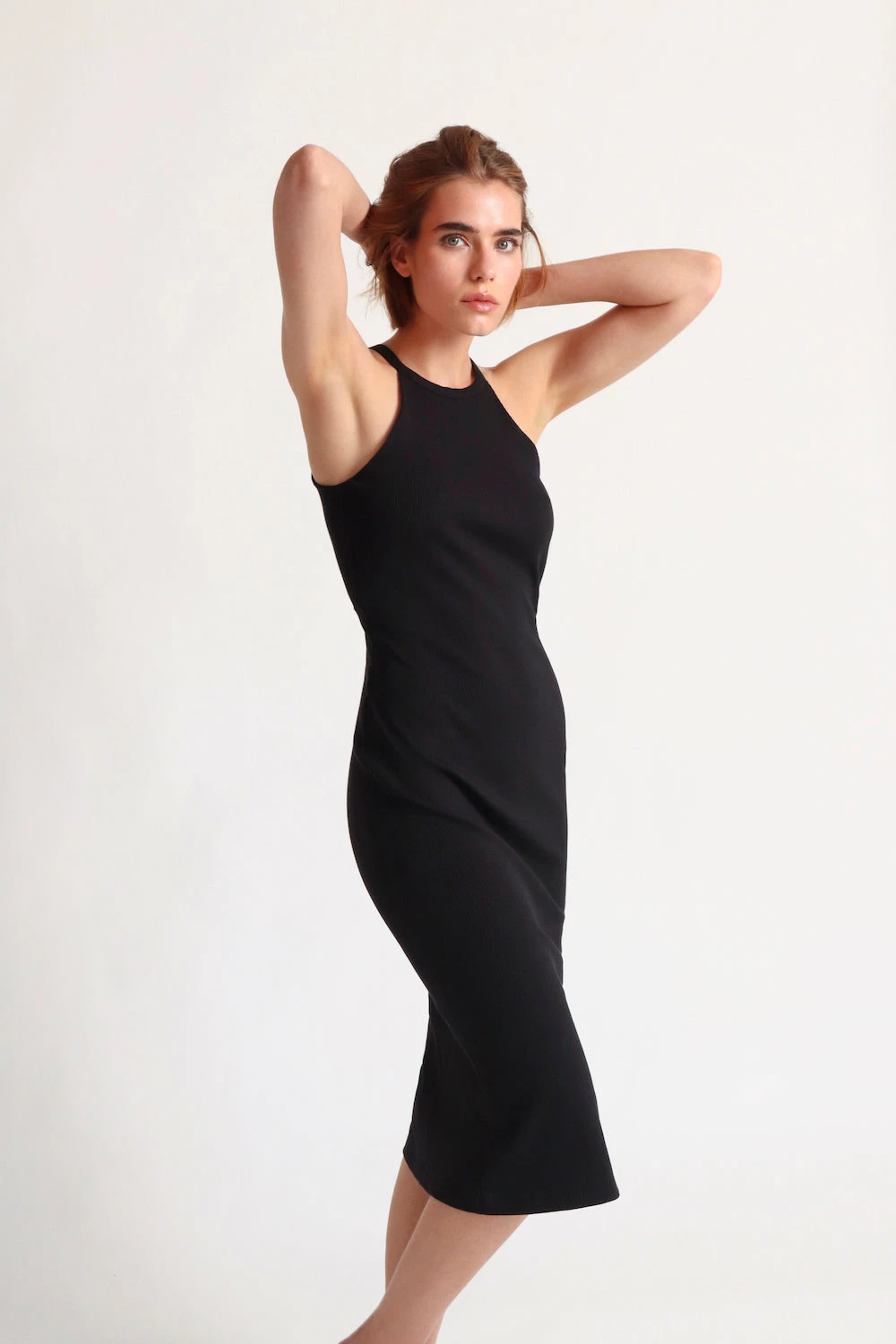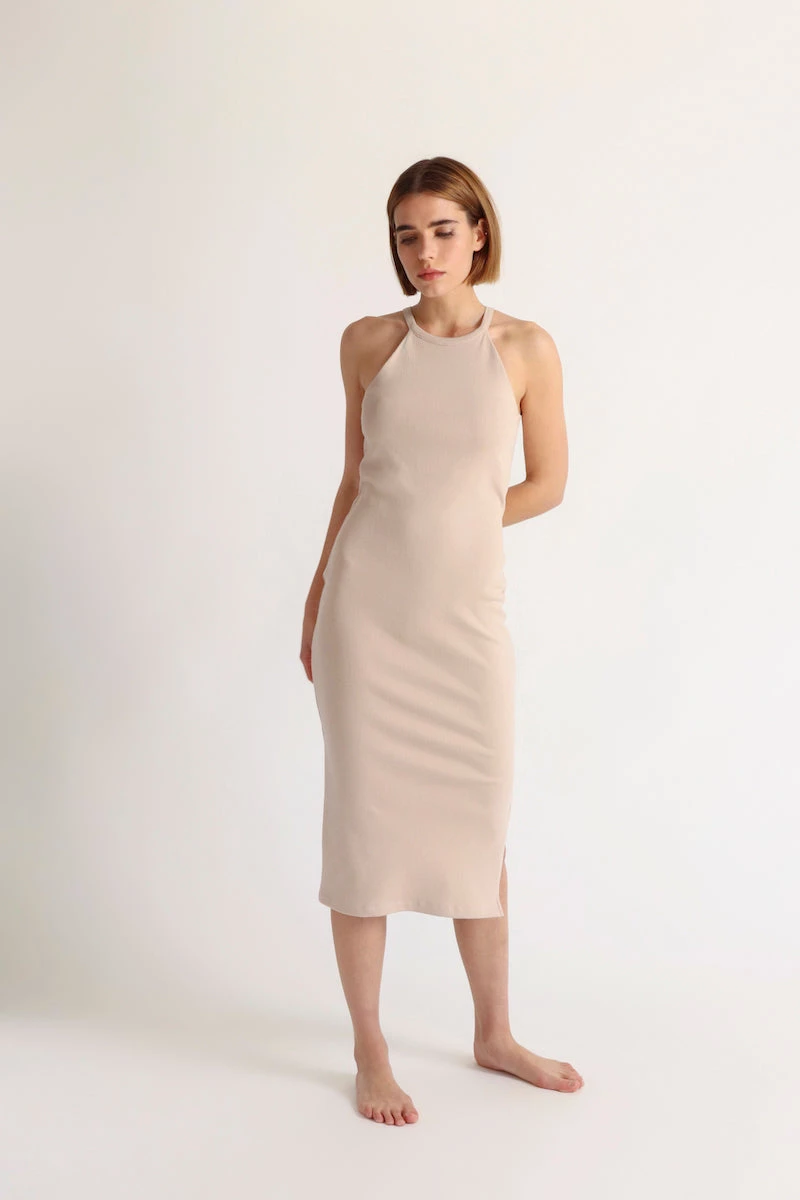 The ribbed, Pima cotton Ivone Dress features a halter neckline, keyhole back and a built in shelf bra for added support.