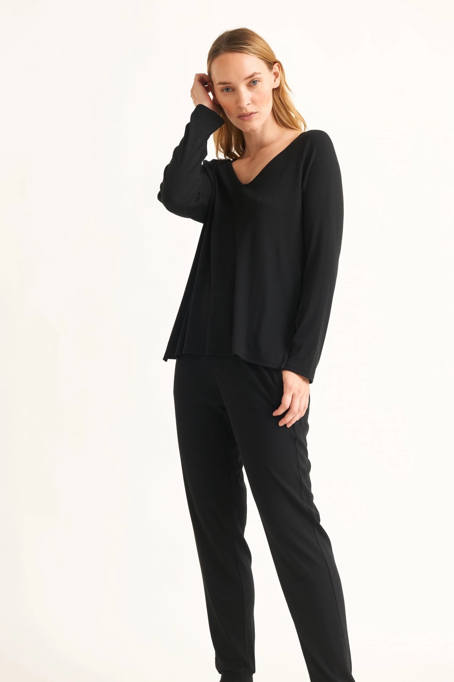 The Nastia Top from our travel collection is wonderfully soft, made from a finely ribbed fabric. A perfect piece to travel with or to lounge at home. Pair them with the Nili Jogger for ultimate comfort.