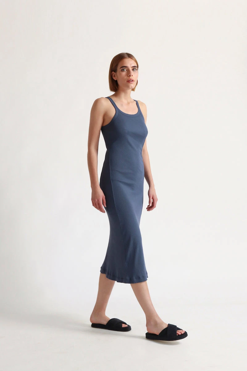 The Radika Chemise in ribbed Pima cotton is fitted and slightly higher cut in neckline. Double layered to mid-thigh. Easy to wear inside or out.