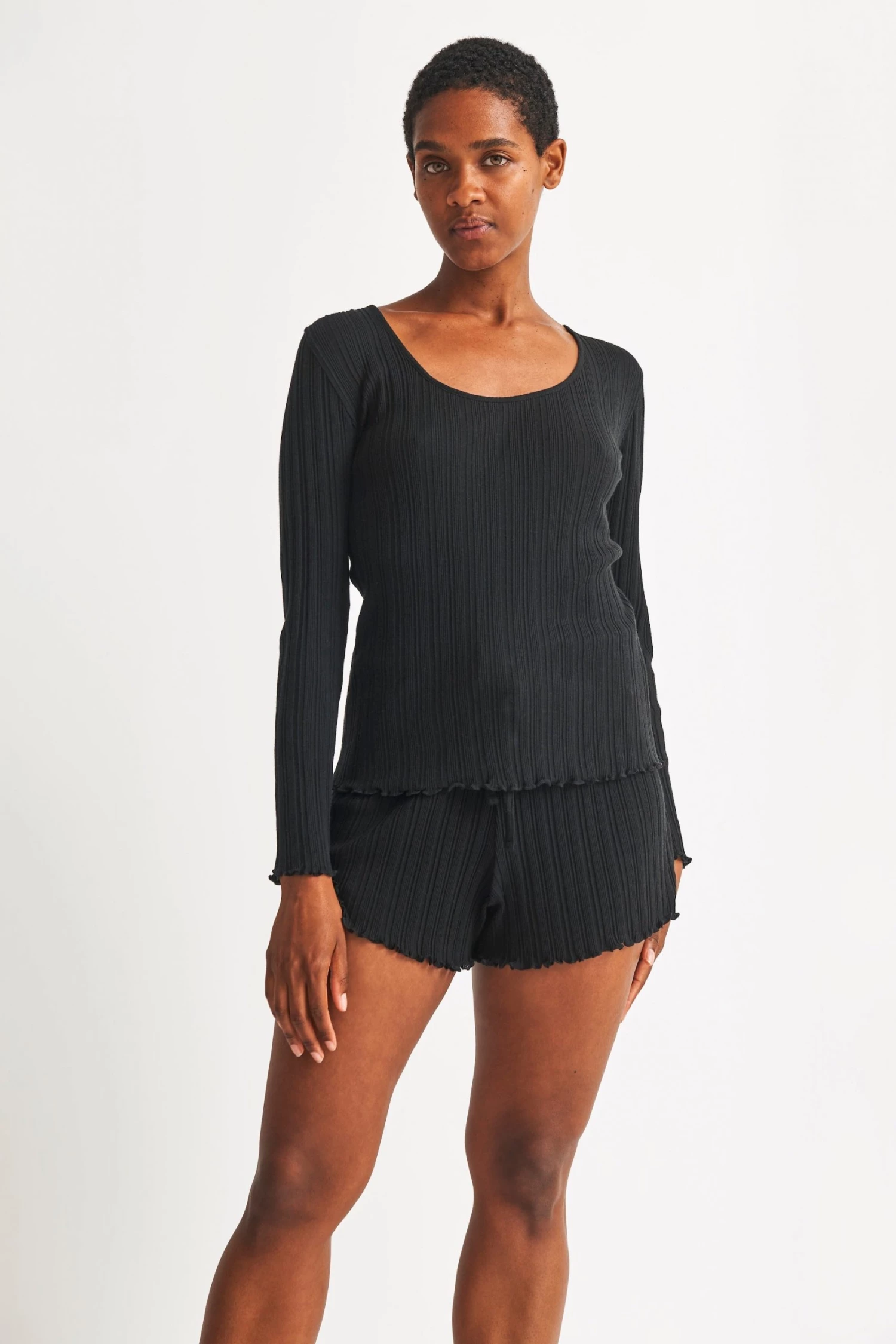 Our Reanna Top is made from ultra-soft ribbed cotton, it has a scoop neckline and a slim frame that’s bordered with a lettuce trim at the cuffs and hem. Pair with the Revel Pant for the complete look.
